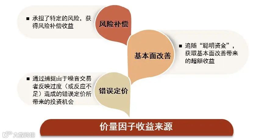 报告提出,价量因子的收益来源主要包括三方面:捕捉噪音交易者导致的错误定价、跟随“聪明资金”获取基本面改善收益,以及承担特定风险获得补偿[k]。