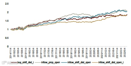 buy_shift_dist_l因子在各宽基指数中均展现出显著超额收益。在沪深300和中证500中,该因子多头组合长期跑赢基准,但在2018–2019年出现阶段性失效[k]。中证1000范围内,inflow_shift_dist_open因子表现突出,分组单调性强,多头组合收益稳健[k]。