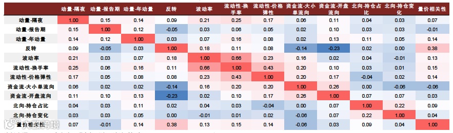 多数复合因子间相关性较低,相关系数普遍低于0.25。其中,流动性-换手率因子与波动率、流动性-价格弹性因子相关性较高,换手率与波动率因子关联性较强。量价相关性因子与反转因子呈弱相关(0.38)[k]。