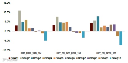 沪深300中corr_price_turn_1M因子多头收益显著且单调性良好