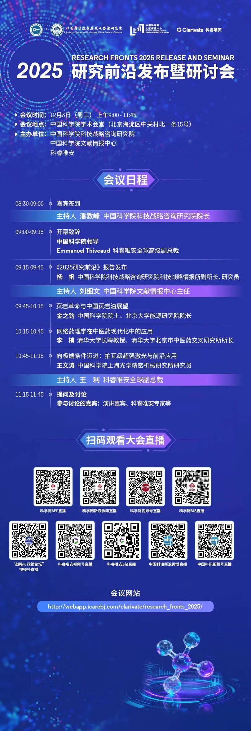 发布《2025研究前沿》是中国科学院“发挥好国家高端科技智库功能,把握世界科技发展大势”的重要举措。中国科学院科技战略咨询研究院、中国科学院文献情报中心与科睿唯安拟于12月3日上午9:00在中国科学院学术会堂举办“2025研究前沿发布暨研讨会”,并邀请表现卓越的研究前沿领域相关专家进行现场解读和研讨。欢迎您在线观看发布会直播!