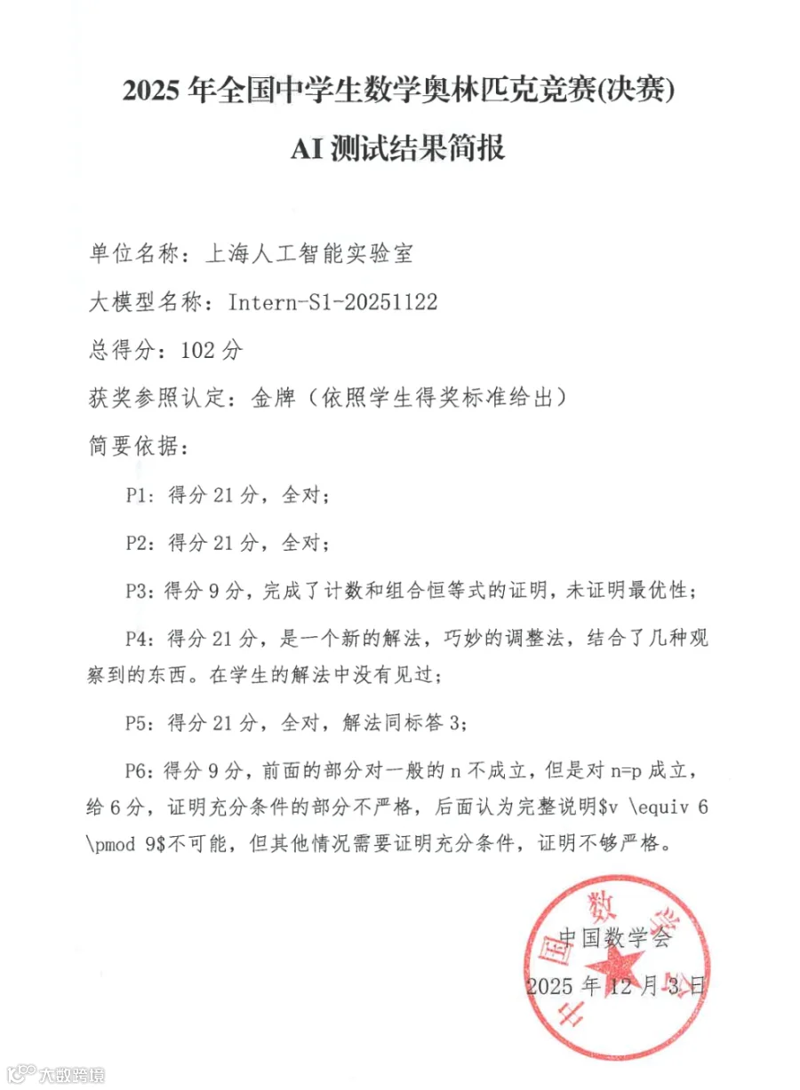 CMO是中国最高规格的数学奥林匹克竞赛,今年,主办方首次设立AI测试环节,邀请大模型与人类同场答题,并交由相同的评委专家组阅卷打分。上海人工智能实验室旗下的书生科学多模态大模型(Intern-S1-20251122)拿到102分。