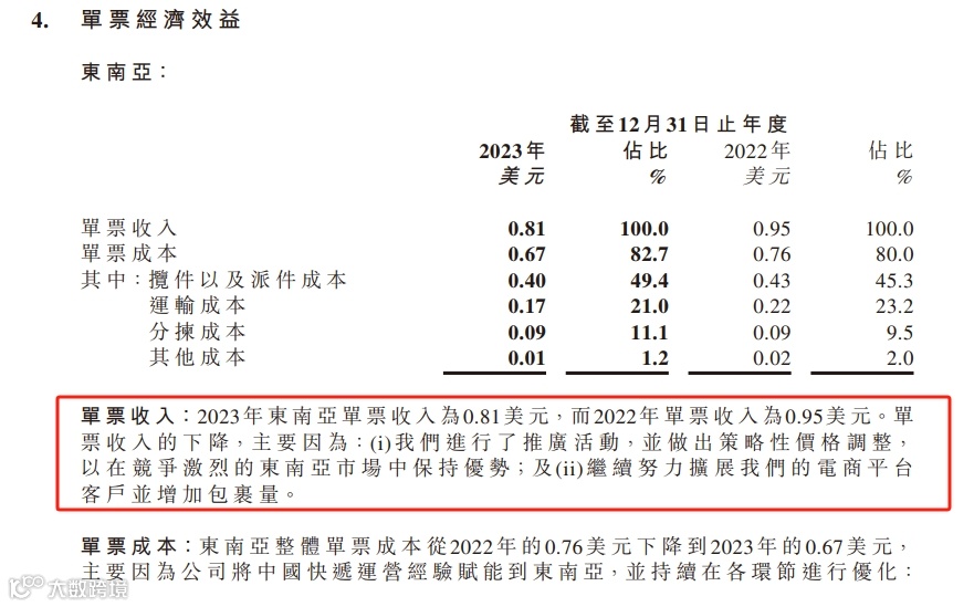 2023年极兔在东南亚的单票收入有所下降。2023年东南亚单票收入为0.81美元,而2022年单票收入为0.95美元,降幅较大,毛利率则由2022年的20%下降至2023年的17.9%。