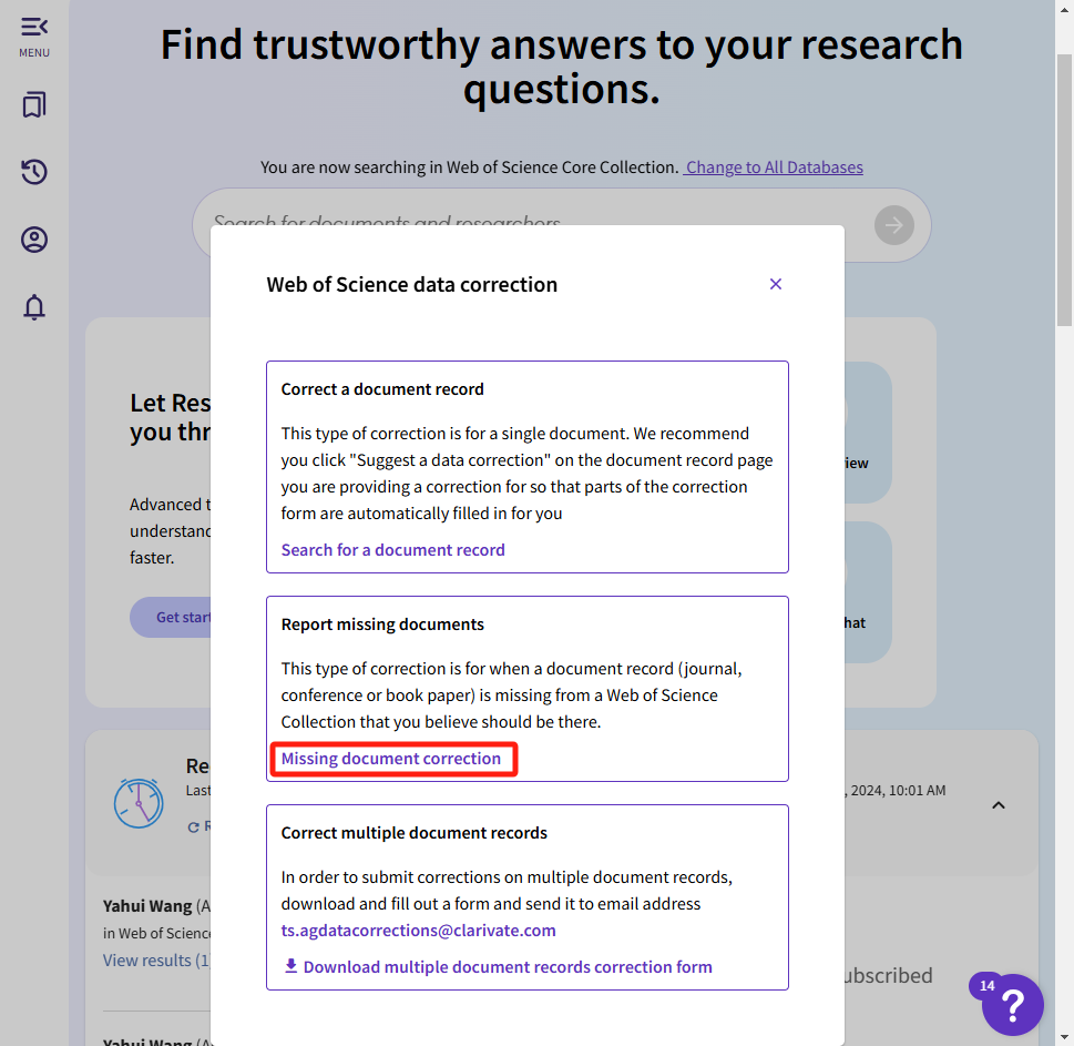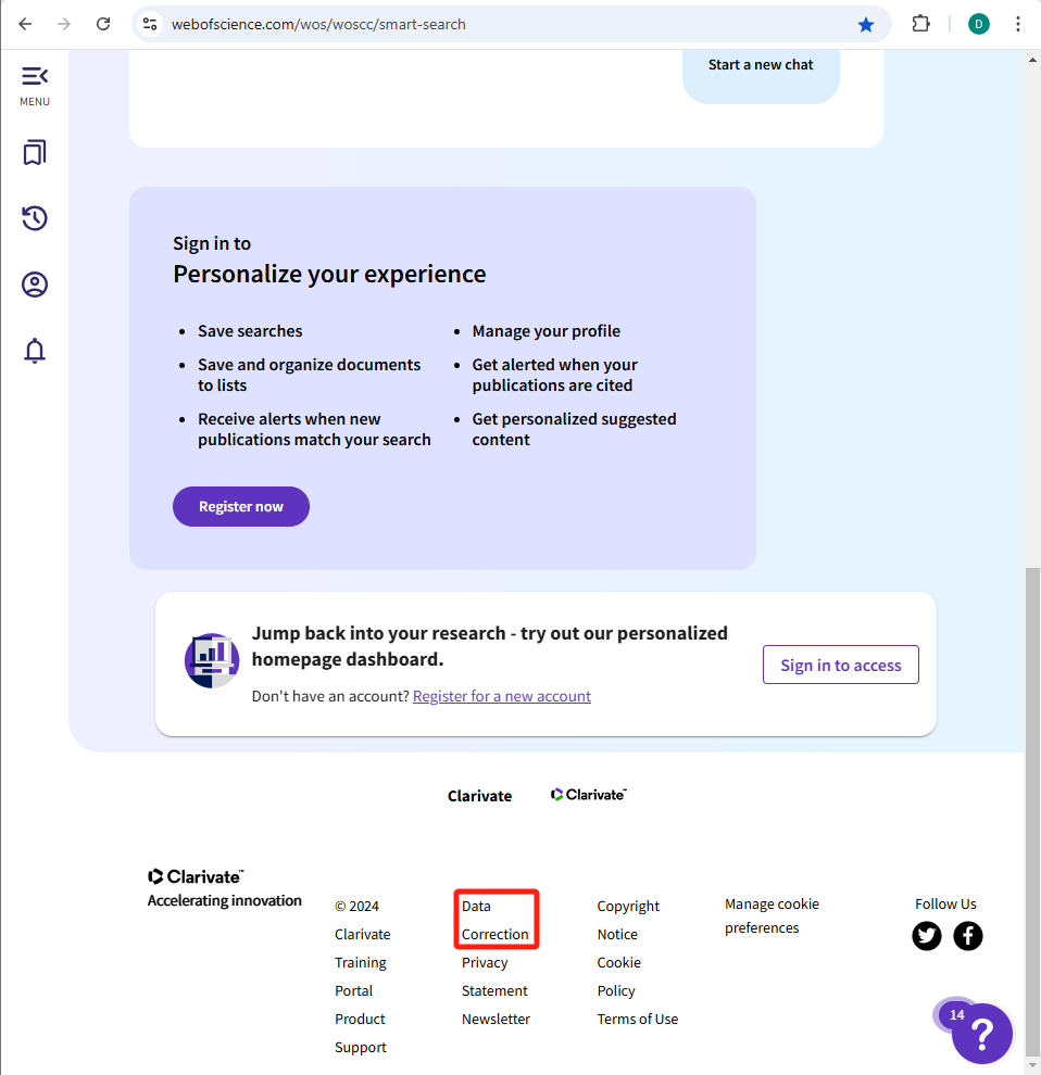 请访问 Web of Science 平台(www.webofscience.com)首页,点击底部的数据修正(Data Correction)。