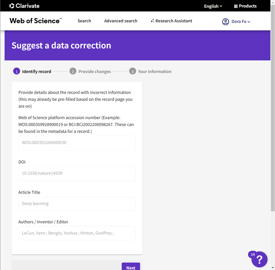 在第二步中 Product 选择 Web of Science Core Collection,Data type that is incorrect 选择Early Access – Merge,在 Incorrect data 填入您在 Web of Science 平台找到该文章的多个入藏号,在 Corrected data(Required) 项填入 Please merge into one record,随后数据团队会进行合并处理。