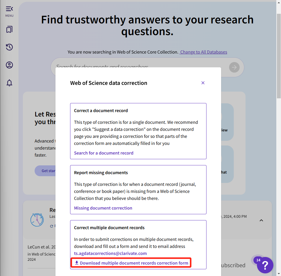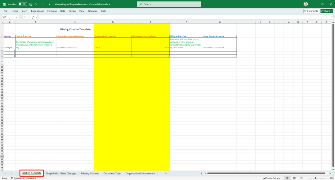 下载 Multiple Request Template Resouce 表格,将被引文章和施引文献逐一填写到 Citation Template 表单中,再发送邮件至 ts.agdatacorrections@clarivate.com,随后数据团队会进行人工核实。