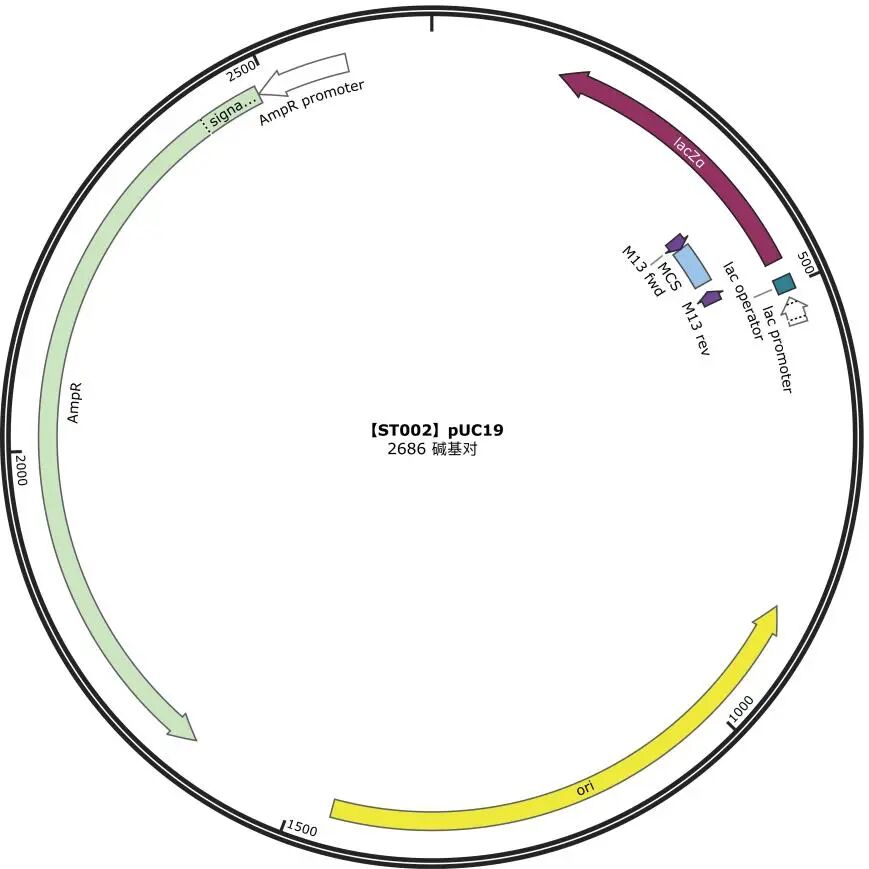 pUC19(高拷贝质粒)+ AmpR → “效率组合”pUC19是一种经典的高拷贝质粒,每个细菌细胞内可存在数百个拷贝,主要用于快速克隆、高效扩增DNA。