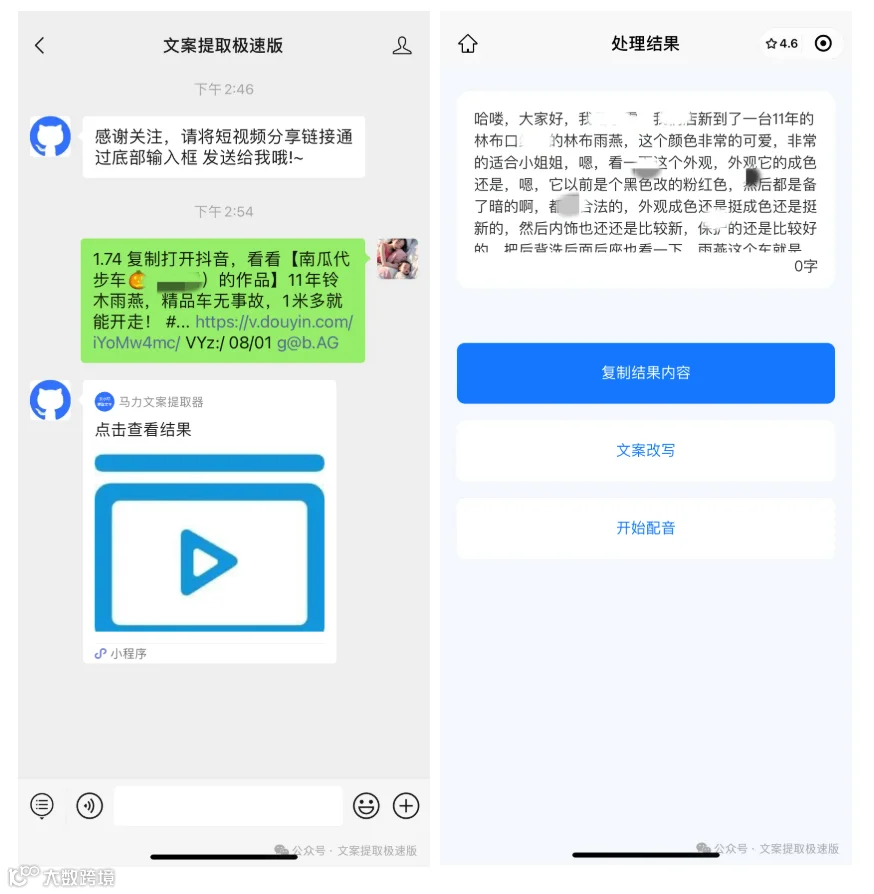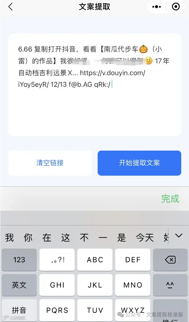 ③发送链接给公众号对话框,即可提取视频文案