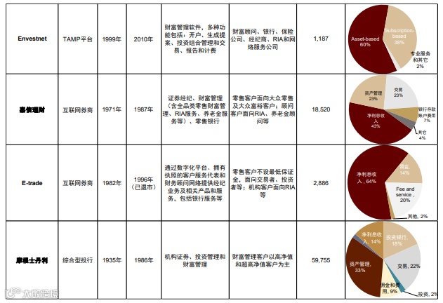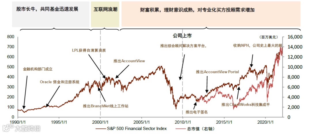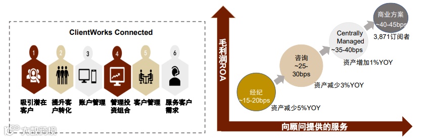 2)1991-2000年布局期:推出行业首批Fee-based平台SAM,1999年上线BranchNet线上工作站,2000年完成自清算转型,形成“清算+金融机构+独立顾问”业务闭环;