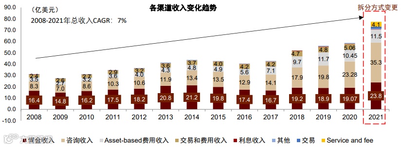 ► 客户现金计划:通过与银行合作将未投资资金转入指定账户赚取利差,2021年末相关资产达573亿美元,属于Asset-based收入的重要组成部分[1]。