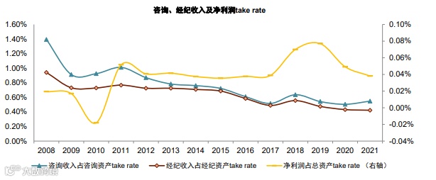 成本结构优化显著,规模效应显现。 公司费用主要由经纪与咨询返佣(占比超70%)及薪酬福利构成,合计占总成本80%以上[k]。随着AUM增长,各项成本占AUM比例明显下降:咨询返佣支出从2008年的0.91%降至2021年的0.43%,薪酬福利从0.15%降至0.06%,其他支出从0.07%降至0.04%[k],体现显著的规模效应。