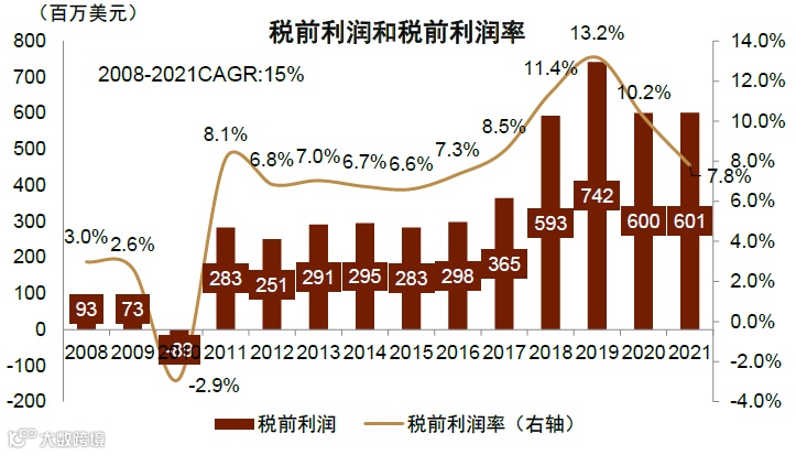 图表:2008-2021年税前利润年均增速约15%