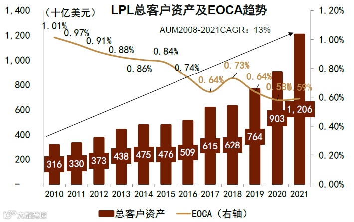 LPL通过连接上游金融产品供应商与下游投资顾问及金融机构,构建一站式服务平台,依托科技能力与深度服务持续吸引投顾加入和客户资金流入[1]。其核心优势体现在:1)投顾数量与客户AUM连续13年正增长,2008至2021年AUM复合增速达13%;2)通过推动经纪账户向咨询账户转化,优化收入结构,提升稳定性;3)规模效应显著,2021年平均资产费用率较2008年下降50%,带动盈利能力稳步提升[1]。
