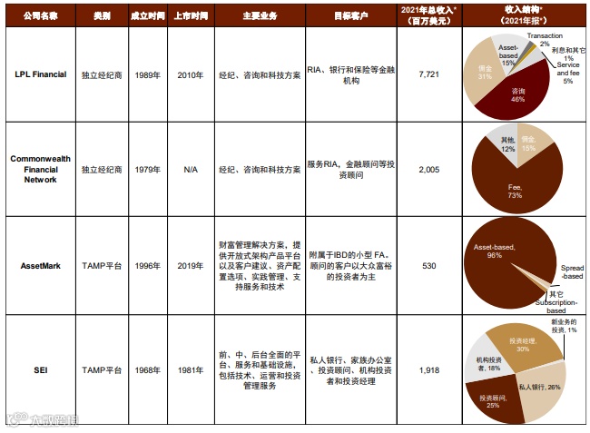 LPL Financial(简称LPL)成立于1989年,由Linsco与Private Ledger合并而成,是美国最大的独立经纪交易商、第三大托管商及最大的金融机构第三方服务商[1]。公司具备Broker/dealer和RIA(注册投资顾问)双重资质,不直接服务个人投资者,而是为独立财务顾问和金融机构提供前、中、后台支持服务,涵盖技术、研究、清算、托管、合规及业务管理等解决方案[1]。截至2021年末,LPL拥有投资顾问19,876名,服务与托管资产总额达1.2064万亿美元,当年实现营业收入77.2亿美元,调整后净利润5.7亿美元[1]。