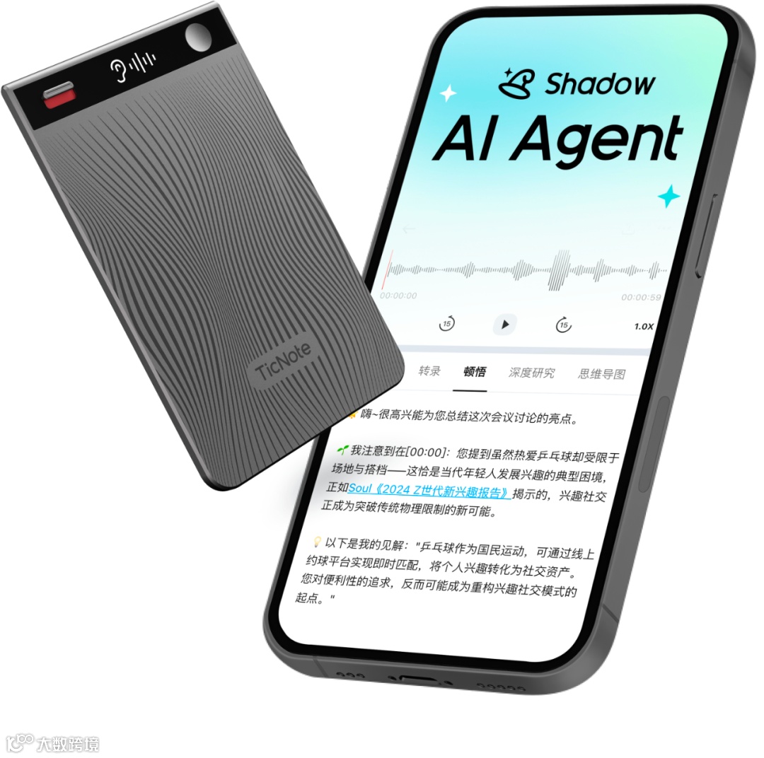 TicNote内置的「Shadow AI」,是其颠覆传统记录方式的核心所在。「Shadow AI」集记录、洞察、灵感闪现、分析、创作、思考功能于一体,具备「看听问推搜」的能力并实现全流程自动化,是用户的AI思考伙伴。 它可以生成:AI智能总结、可视化思维导图、深度研究报告、Aha 顿悟时刻、自动生成播客内容。