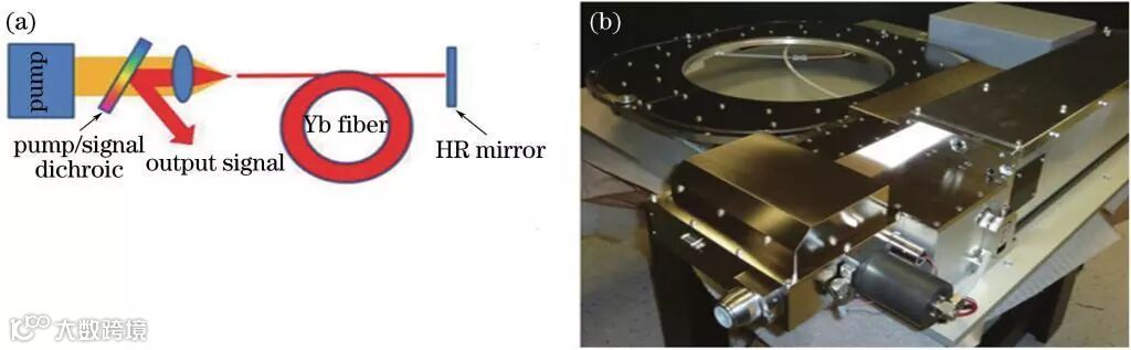 2014年Ramachandran等利用二向色镜以及数值孔径低至0.046的掺镱光纤,采用2个975 nm的二极管阵列作为抽运源,得到了3 kW的激光输出,如图3所示(HR表示高反射率)。如果光纤的数值孔径变得更低,可以获得更高的激光输出。这种方法利用分立的光学元件来实现抽运光耦合,需要非常精密的调节,系统稳定性不高,并且扩展能力较差,一般局限于实验室研究。