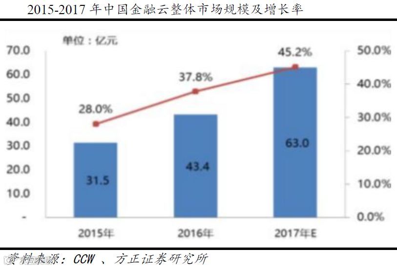 据Gartner报告,2016年全球云计算市场规模是2066亿美元,金融云占其中份额超过20%,随着对于云计算、云迁移等服务的旺盛需求,全球云业务市场正走向成熟,势头迅猛。金融领域是当前中国云计算应用需求最为迫切的领域之一,大量金融机构正在开始应用自建私有云或第三方公有云合作的方式来承载应用和处理高并发业务。目前有40%的金融机构尝试将IT业务搭建在云上,未来这一数字还将持续增长。方正证券指出,金融云市场目前仍处于发展前期,现阶段各厂商所占份额比较分散,尚没有哪家公司在市场中形成足够的统治力。