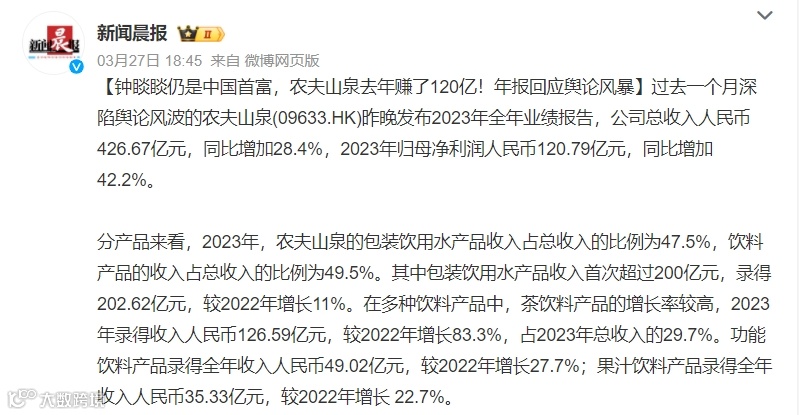 农夫山泉还在年报中表示,“近期集团受舆论影响,亦面临挑战”;同时,农夫山泉表示“未来将加强品牌建设,灵活适应市场变化”。