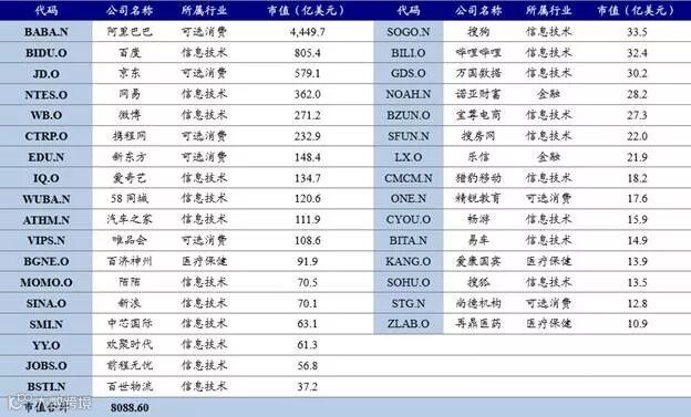 《独角兽报告》显示,目前在美中概股共188家,总市值1.77万亿美元,折合11.1万亿元人民币,相当于A股总市值的19.9%。从发行方式看,有105家企业以ADR(美国存托凭证)方式上市,占比56%;从行业分布看, “四新”企业主要分布在信息技术、可选消费、医疗保健和金融行业,合计占比67%,其他企业主要分布在能源、工业和公用事业等传统性行业。其中,市值大于10亿美元的“四新”企业约为33家,市值合计约8090亿美元,并且这些企业在赴美上市前大多获得过VC/PE机构的投资。