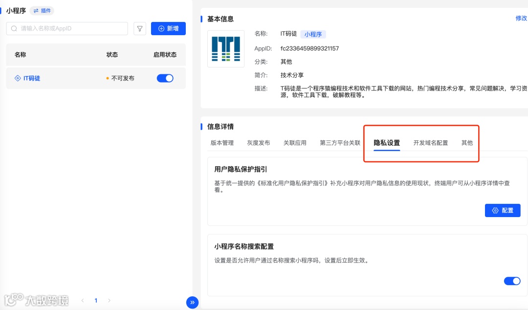 点击左侧「小程序」-「新增小程序」,添加小程序相关信息。