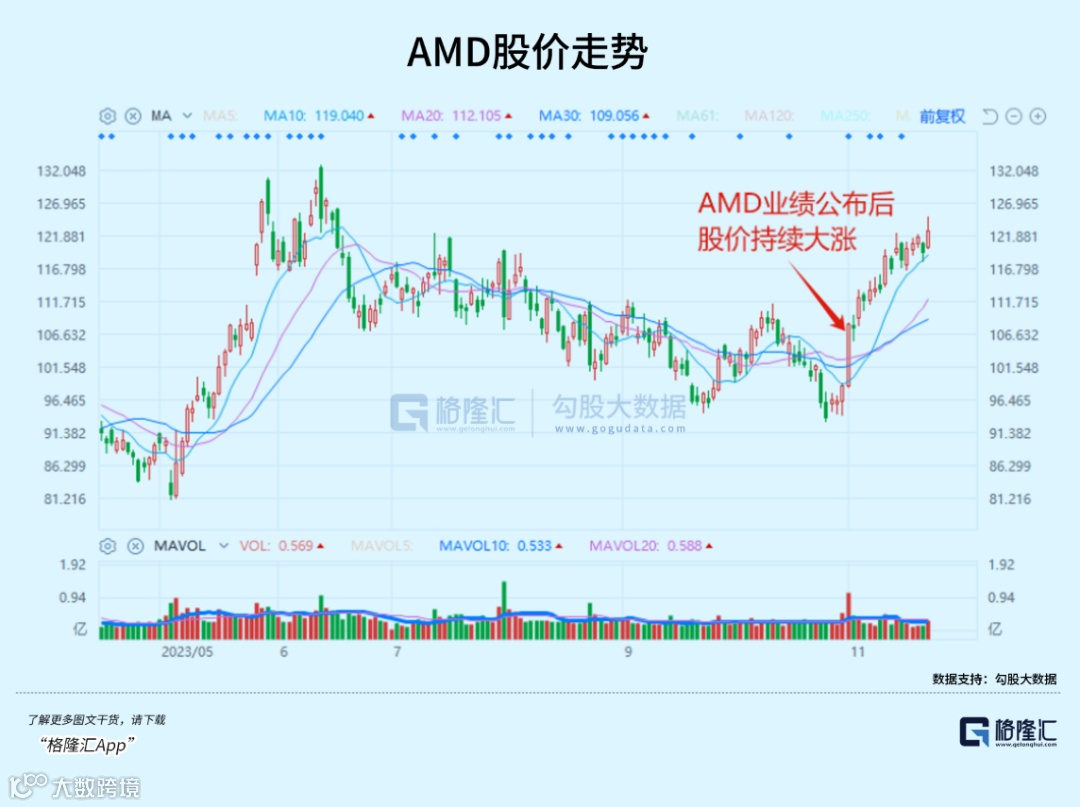 因为强劲的业绩指引,AMD在发布业绩后,AMD股价周三收盘大涨9.7%,并在此后数日持续上涨。