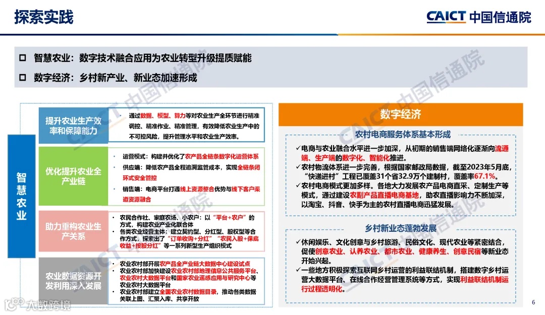 近日,中国信息通信研究院(简称“中国信通院”)发布了《数字乡村发展实践白皮书(2024年)》,系统梳理了我国提出数字乡村发展战略以来,政府、企业、高校、科研院所和社会组织等各类主体在相关领域的实践做法及成效,充分结合国家数字乡村试点和多个省级试点发展经验,总结提炼了基于实践的经验模式和路径,希望为政府、行业、企业决策提供参考。