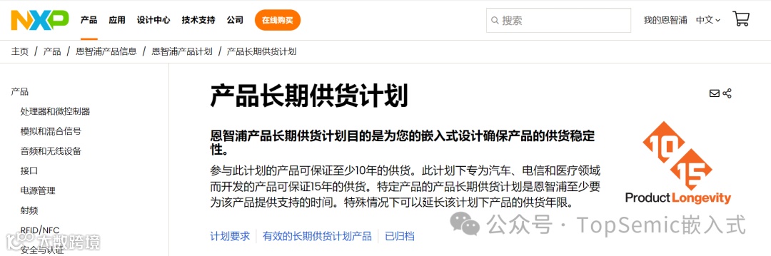 由于被这俩公司给伤透了心,他表示以后再也不用这俩公司的MCU了。后面又换回了瑞萨的MCU,他表示自己更在意芯片的长期供货稳定性,价格其次。提到长期供货,国外的一些MCU显然做的更好一点,比如NXP有一个产品长期供货计划,参与此计划的产品至少保证至少10年/15年供货期。