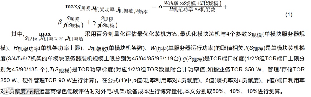 此外,针对不同服务器功率(300~850 W)与不同机房配套(单机架运行功耗4~14 kW)时,如何匹配模块化装机方案,本文提出一种最优模块化装机模型算法。各服务器功率使用不同模块化装机方案评估时,通过公式(1)进行计算,使得模块内机架运行功率利用率、机架空间装机率、TOR端口利用率综合最优,可得到最优装机方案及对应最优单机架功率上限。根据公式(1)的测算,截至2027年,5机架组成的大模块(L值为95.86)装机优于3/6/7机架模块化装机(L值分别为93.74、91.54、95.74),该最优模块装机下单机架运行功率上限需达14.2 kW。