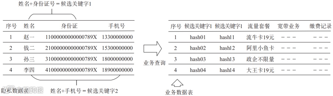 针对隐私数据所在的数据库,可进行表空间拆分优化。隐私数据库的表空间优化示意图见图5、图6。可将完整的数据表分为隐私表与对应业务表两部分。其中,业务表中的多个候选关键字为隐私表中隐私要素的Hash值。只需针对隐私表进行重点保护,而业务表即便泄露,其不含隐私信息从而影响不大,这就取得了数据库优化及隐私保护的成本优化。