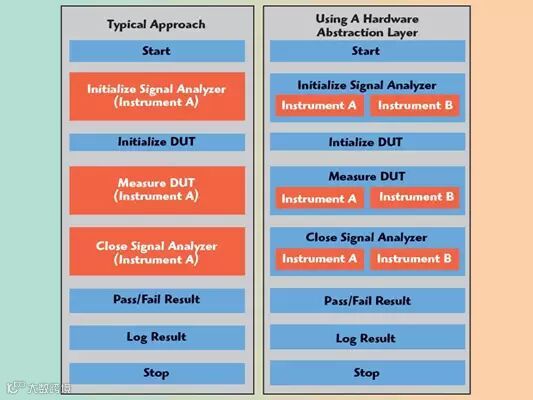 编写测试软件代码中一个简单的最佳方法是采用硬件抽象层。该方法是将对特定设备的底层驱动调用封装在更高级的函数中。这种方法使得未来修改测试代码、添加额外设备的工作变得更为简单,而不需要大范围地重写。如图3所示,使用硬件抽象层需要测试代码的架构能够让特定仪器的驱动程序调用包含于该仪器产品系列的函数调用框架之中。虽然这需要更周全的前期设计,但使用硬件抽象层可提高测试代码的复用率,最终减少测试软件开发的时间。请注意,相比于其他本身具有层次性的编程语言,比如NI LabVIEW系统设计软件或其他类似的语言,硬件抽象层的层次性相对更为直接。
