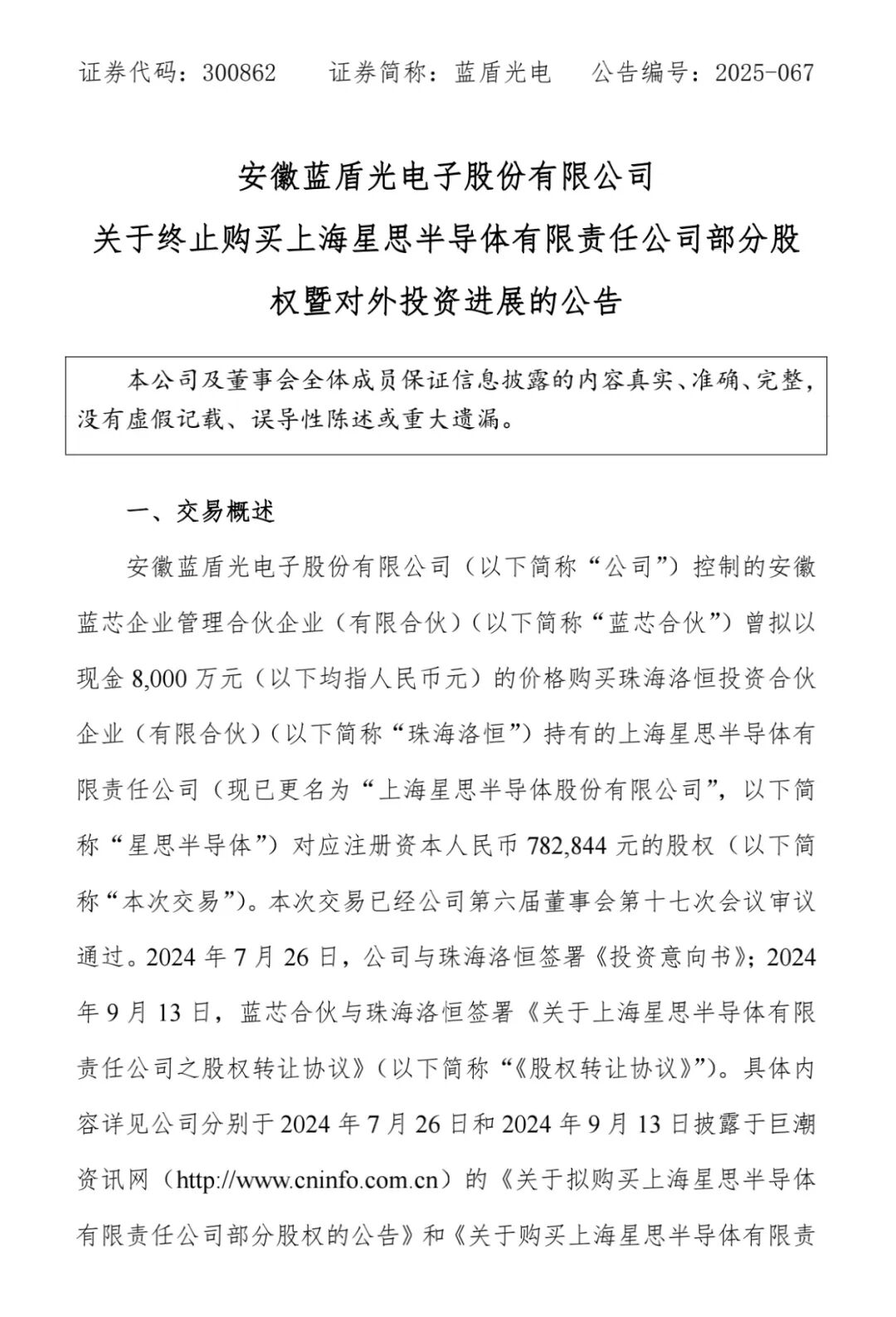 2025年12月11日晚间,蓝盾光电(300862)发布公告称,公司及控制的蓝芯合伙决定终止以现金8000万元购买星思半导体部分股权的交易,该事项已获公司第七届董事会第七次会议审议通过,交易双方已签署终止协议 。这场历时近一年半的跨界并购案,最终以“未交割、未付款”的方式画上句号。
