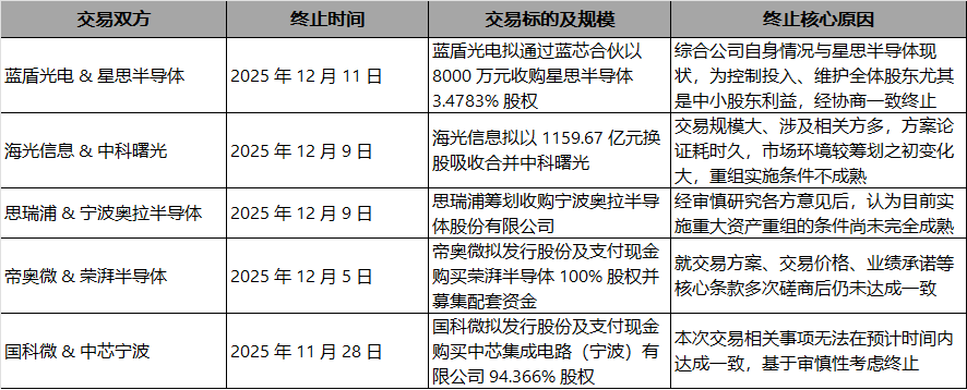 蓝盾光电此次收购终止并非个例,近期资本市场已出现多起重点并购案“折戟”事件,其中最具代表性的当属中科曙光与海光信息的千亿级整合案。2025年12月9日,两家科技巨头公告终止旨在打造“国家级算力航母”的重大重组,原计划通过业务整合实现芯片设计与服务器制造、算力服务的全产业链闭环,最终因“市场环境较筹划之初发生巨大变化”宣告终止。