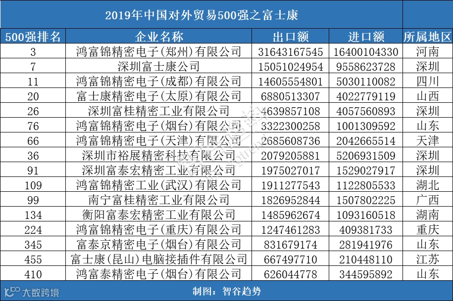 比如鸿富锦精密电子(郑州)有限公司,出口额达到316.43亿美元;深圳富士康公司,出口额150.51亿美元;鸿富锦精密电子(成都)有限公司,出口额146.06亿美元;富士康精密电子(太原)有限公司,出口额68.81亿美元……