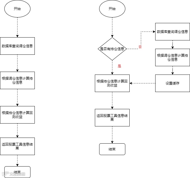因为策略轮动的调仓信息,每周只更新一次,所以原来的调接口就去查库的逻辑并不合理,而且拿到调仓信息后,需要经过复杂计算,最终得出回测收益和跑赢沪深指数这些我们想要的结果。如果我们把查库操作和计算结果放入缓存,可以节省很多的执行时间。如图: