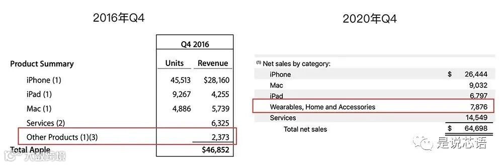▲苹果可穿戴设备,家居和配件业务2016年Q4和2020年Q4营收对比(苹果在2018年将“其他产品”业务更名为“可穿戴设备,家居和配件”,涵盖Apple Watch、Beats和HomePod等产品)
