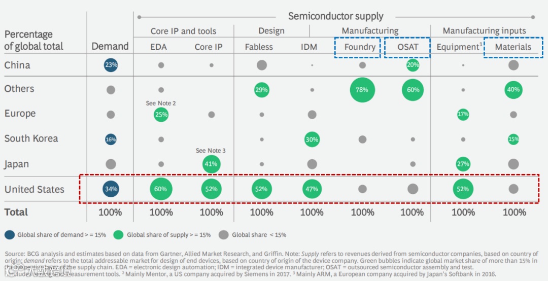 可以看到,美国在几乎全产业链领域都是“最强”的,除了材料和制造。而其中只有制造,美国看起来相对比较弱,其实有Intel,这个“落后”也还好。即使是材料领域,美国也和日本、韩国相当。