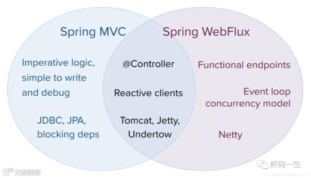 webflux 提供了相当多的选择;在服务层,可以使用(Netty, Tomcat, Jetty, Undertow, 和3.1版本以上的Servlet容器)作为web服务;在应用层,可以选择用 @Controller 定义还是使用函数编程定义;在编程风格上,可以选择用Reactor、RxJava或其他。