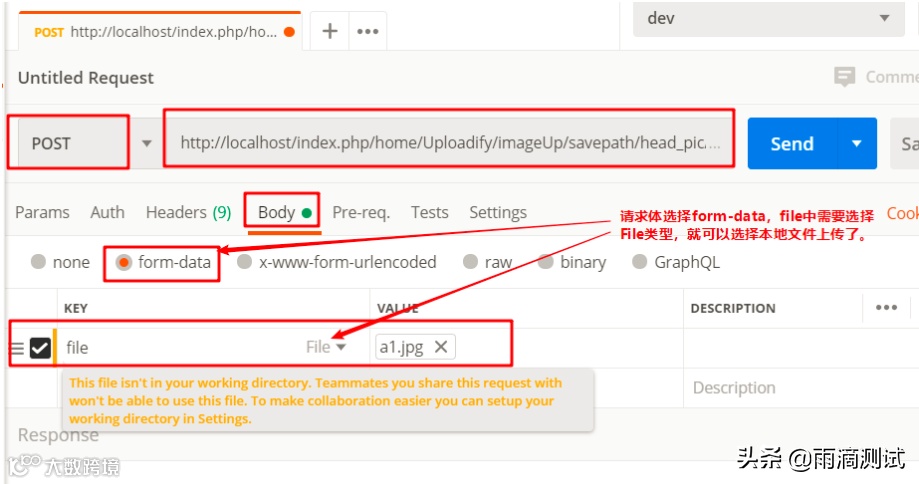 在请求中设置以上四个参数,点击Send按钮。注意:在postman中设置请求体类型,需要选择body-> form-data 。file中要选择File类型,然后上传本地的文件 。 -