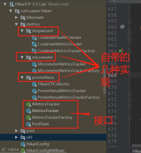 不同于Druid那样监控指标那么多,HikariCP会把我们非常关心的几项指标暴露给我们,比如当前连接池内闲置连接数、总连接数、一个连接被用了多久归还、创建一个物理连接花费多久等,HikariCP的连接池的监控我们这一节专门详细的分解一下,首先找到HikariCP下面的metrics文件夹,这下面放置了一些规范实现的监控接口等,还有一些现成的实现(比如HikariCP自带对prometheus、micrometer、dropwizard的支持,不太了解后面两个,prometheus下文直接称为普罗米修斯):