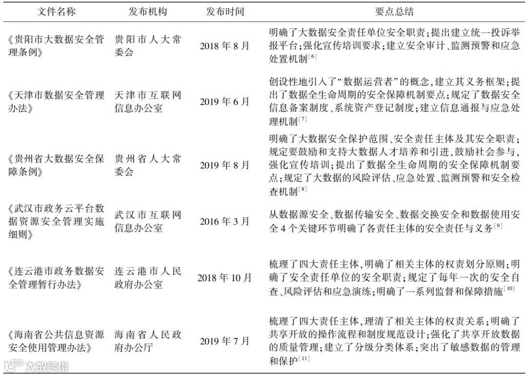 表1 我国地方政府大数据安全相关法规规章要点分析