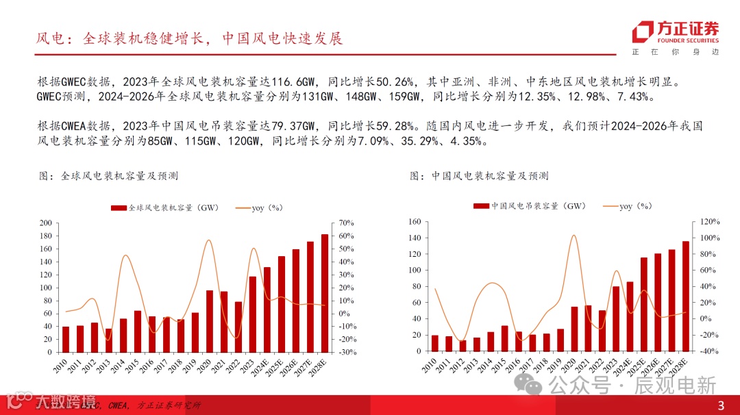 风电装机稳健发展,大型化更新加速。根据CWEA数据,2023年中国风电吊装容量达79.37GW,同比增长59.28%。随国内风电进一步开发,我们预计2024-2026年我国风电装机容量分别为85GW、115GW、120GW,同比增长分别为7.09%、35.29%、4.35%。2023年国内陆上风电吊装平均单机容量达5.4MW,同比增长26%;海上风电吊装平均单机容量达9.6MW,同比增长29%;国内风电大型化快速发展。