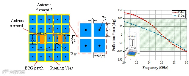 图1 (a)具有EBG接地的E形贴片天线的俯视图,(b)设计的EBG结构单元两种极化的反射相位