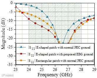 我们在设计中引入了EBG结构来取代传统的金属地板。EBGG的同相反射特性可以拓宽元件的方向图;它的带隙特性可以抑制元件之间的表面波,从而减少相互耦合。如图1(b)所示,对于设计合理的EBG元件,特别是带有通孔的EBG元件,这两个独特的特性可以在相同的工作频带内重合,再加上设计合理的元件方向图,可以实现紧凑型天线阵列的广角扫描。