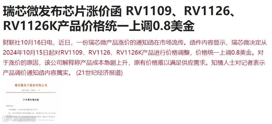 瑞芯微在涨价函中表示,由于上游产能紧张及供应商价格上涨,导致公司RV1109、RV1126系列产品成本急剧上升,原有价格难以满足供应需求,为保证产品的供应,公司慎重决定从2024年10月15日起对RV1109、RV1126、RV1126K产品进行价格调整,价格统一上调0.8美元,即日起在途和未交订单按照新价格执行。