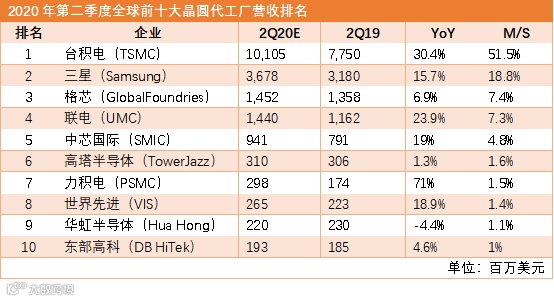 从代工厂来看,目前排名靠前的几家代工厂,台积电、三星、格芯(GlobalFoundries)、联电、中芯国际、高塔半导体等,台积电承担了海思半导体的绝大多数业务,因此也成为了美国打击华为的有力武器。