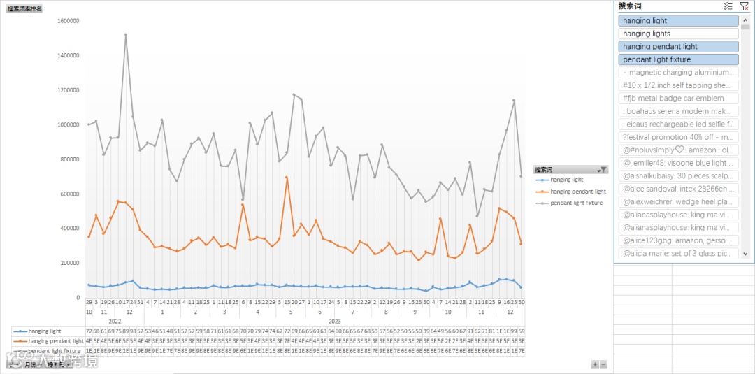 在筛选器中输入核心关键词,即可查看其在2022–2023年间的搜索排名趋势变化,从而判断市场需求的淡旺季周期[k]。
