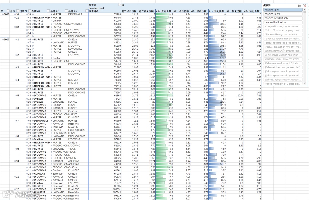 定期从亚马逊后台下载ABA(Amazon Brand Analytics)数据,可有效监控关键词排名变化,并支持多关键词对比分析。通过导出的表格,还能查看搜索结果前三ASIN的点击共享与转化共享等关键数据[k]。