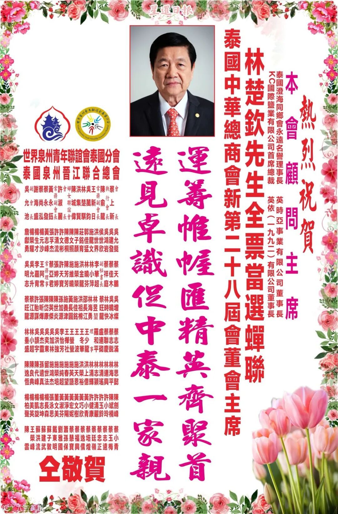 泰国华商联谊会成立至今已30年历史,一直以来,承蒙中国驻泰大使馆,泰华社团首长的关心和爱护,在历届会长的领导下,会务蓬勃发展,打下了良好基础,承蒙大家的厚爱和信任,推选本人出任新届会长,本人才疏学浅,故真诚希望得到诸位德高望重前辈的扶持和指导,惠赐教益,以及会董们的鼎力支持,同心协力,发扬爱会精神,拓展新会务,为社会作出更多新的贡献。