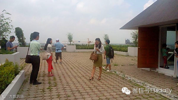 实景拍摄星暹工作人员带客户看随房赠送的超大露台。
