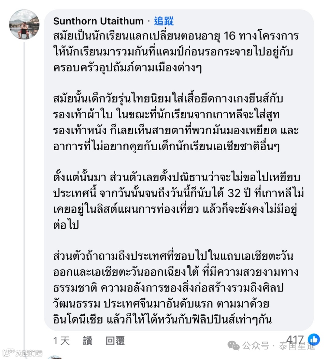 我16岁时候参加一个学生交流项目,泰国学生喜欢穿衬衫牛仔裤运动鞋,韩国学生都穿着西装皮鞋,他们的眼神就充满了对我们的歧视,而且也不和东南亚各国的学生交流聊天。